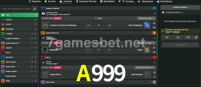O A999 oferece uma grande seleção de opções de apostas em e-sports com probabilidades competitivas